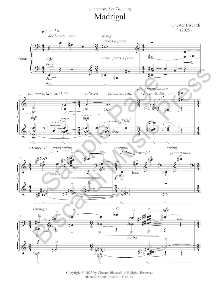 Madrigal is written in memory of the remarkable Les Thimmig, composer, virtuosic improviser and performer, musical architect, bold and gentle spirit, and my mentor and friend. It also pays homage to Luca Marenzio’s 1599 madrigal, “Solo e Pensoso,” based on “Sonnet XXXV” by Francesco Petrarca. Thimmig’s 1973 Arrhythmia, a dynamic, haunting work for wind ensemble, musically evokes Fellini’s Satyricon. In turn, Madrigal incorporates Arrhythmia’s “Mother Chord” and echoes Marenzio’s setting of the first two lines of the Petrarchan sonnet.